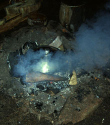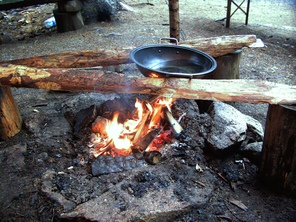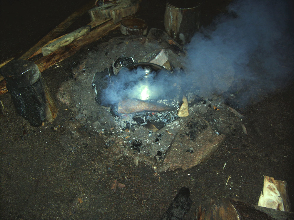 Um mit nur einem Topf für sieben Leute kochen zu können, muß schon vorher ordentlich geplant werden. Erst lauwarmes Wasser zum Brot backen aufsetzen - abwaschen - dann die Gemüsepfanne köcheln lassen - abwaschen - Kaffee kochen - abwaschen - Brotteig in den Topf und ab damit in die Glut zum backen. |