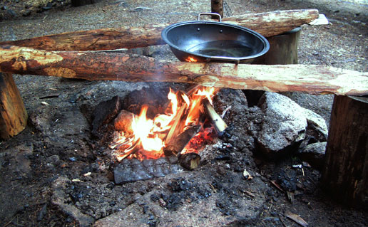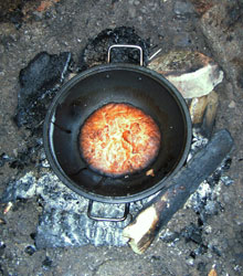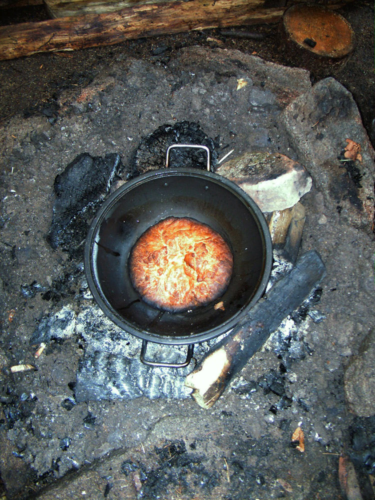 Über die Tage hinweg haben wir verschiedene Brote gebacken und unterschiedliche Backmethoden ausgetestet. Weißbrot über dem Feuer, Mehrkornbrot in der Glut und dunkles Brot im Topf. Nach einigem Üben haben wir es so gut hinbekommen, daß wir mit keiner Bäckersware hätten tauschen wollen. |