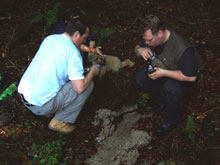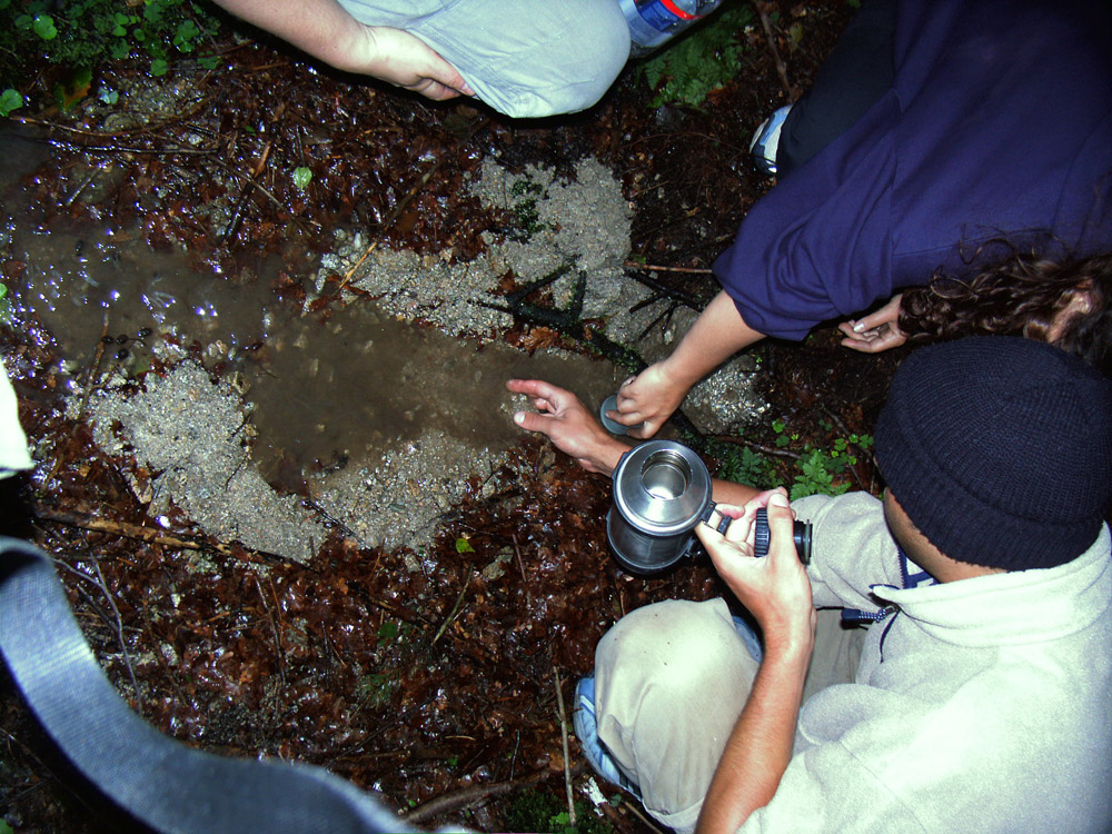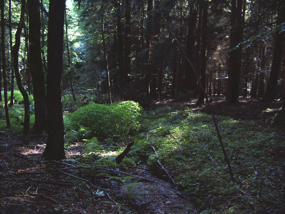 Als die Wasservorräte knapp wurden, kam es uns gerade recht, daß wir einer Waldläuferin begegneten. Sie zeigte uns eine 1,5 km entfernte Bergquelle im Wald, aus der kühles und sauberes Wasser austrat. Nachdem wir uns satt getrunken hatten füllten wir die Feldflaschen, um Wasser zum Kochen und für den Tee zu haben. |