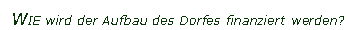 Wir befinden uns derzeit aktiv auf der Suche nach einem Investoren, der in den Dorfaufbau € 75.000,- investiert, um später mit uns zusammen das Projektangebot vertreiben zu können. Ein detaillierter Rückzahlungsplan und eine vereinbarte Gewinnbeteiligung wird entsprechend festgesetzt und fließt vertraglich in die Firmengründung mit ein (Nähere Informationen entnehmen Sie bitte dem Finanzierungsplan).